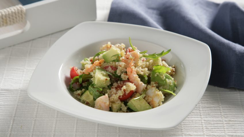 Quinoa con aguacate, tomates cherry y gambas